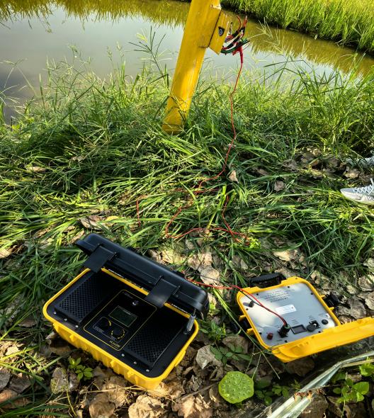 实际操作中,首先应定位距离管道最近的测试桩,按照规范顺序进行接线:先连接接地线,再接管道测试线,最后接通电源。随后根据探测需求(本次任务仅需获取管道位置及埋深)选择合适的单频信号,如128Hz或640Hz。若现场附近有接地较好的位置或水源,可优先利用其作为接地点,以提升接地效果,最大可使电流达到4A,进一步增强探测信号的强度和可靠性。在本次探测任务中利用附近池塘将接地钎插入池塘中可以获得较好的回路效果,电流能达到2A以上。