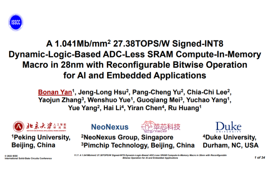 目前,有着“集成电路设计领域奥林匹克大会”之称的IEEE国际固态电路会议ISSCC 2022正在火热进行,临时变为全面线上会议的形式并没有减少学者与工程师们对它的密切关注。ISSCC是世界学术界和企业界公认的集成电路设计领域最高级别会议。在此次会议上,苹芯科技发表题为“A 1.041Mb/mm227.38TOPS/W Signed-INT8 Dynamic Logic Based ADC-Less SRAM Compute-In-Memory Macro in 28nm with Reconfigurable Bitwise Operation for AI and Embedded Applications”的论文,文章提出高效的无ADC架构SRAM存内计算加速引擎,基于28nm工艺搭建模块可以达到27.38TOPS/W的高能效比,同时实现高达1.041Mb/mm2面效比,达到国际领先指标并实现技术突破。