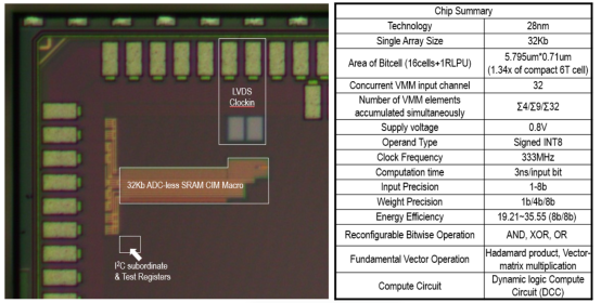 本次工作实现了28nm 技术节点的 32Kb 无 ADC SRAM存内计算加速单元,由动态逻辑计算电路(DCC)替代传统ADC或CMOS静态逻辑,实现高能效比与面效比。同时由可重构本地处理单元(RLPUs)实现bitcell数组逻辑运算,并拓展至向量矩阵相关计算(VHP/VMM),在核心指标方面相较于传统架构具备数量级优势,为存内计算技术的实际产业化应用部署奠定坚实基础。