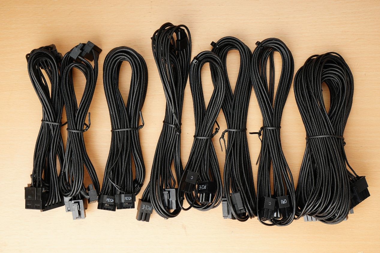 所有线材均采用了压纹线,不论是柔软度以及质感都相当的不错,线材整体做工质量上乘,其实这种线材在走线的时候远要比现在扁平化的线材要好处理很多,现在的扁平化线材在横向面积上的加大反而使其非常不好整理,还是这种压纹线更为实用好用。配件到这里基本介绍完毕了,下面就来看看装机效果如何,先来看看风冷的装机效果吧。