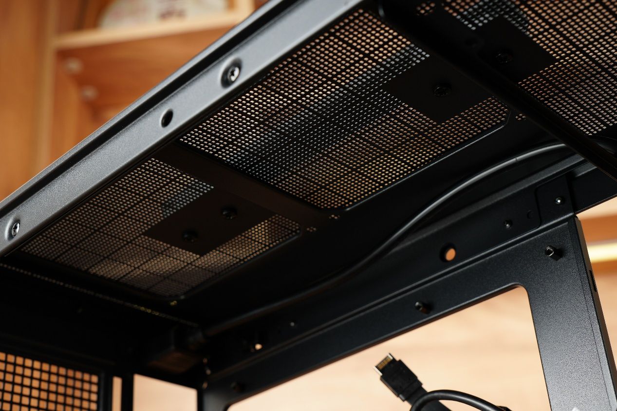 机箱顶部设有两个12cm风扇的安装支架。