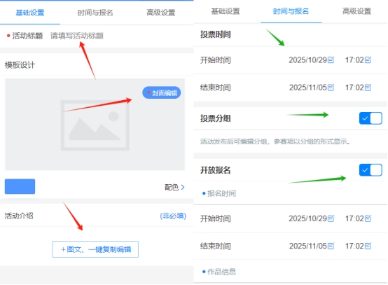 投票时间(起止日期)、活动介绍(3-5句话描述一下活动目的及规则)。