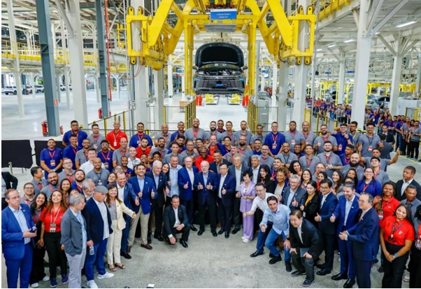 巴西总统卢拉、比亚迪董事长兼总裁王传福与比亚迪巴西卡马萨里工厂员工合影