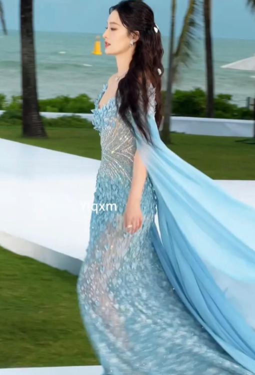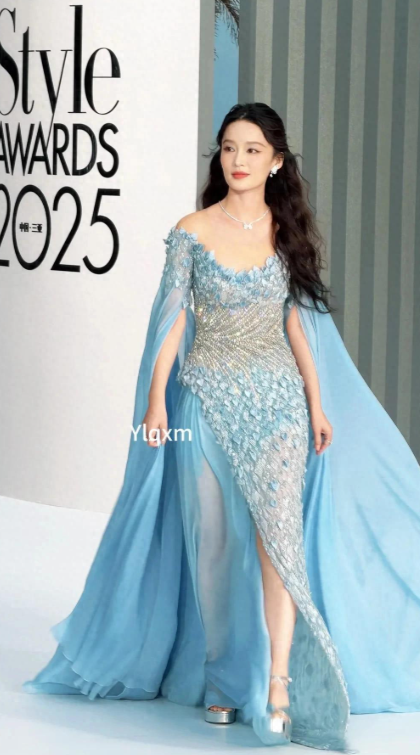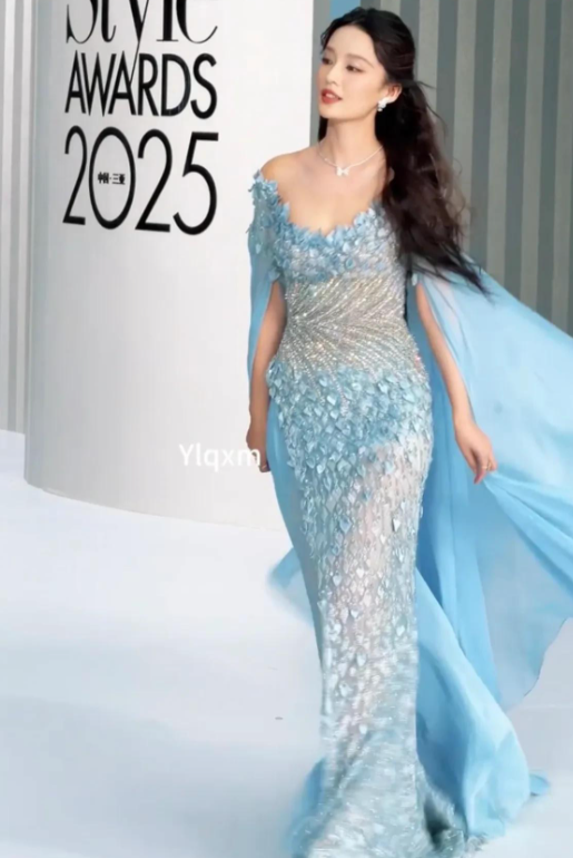 亮片星光,演绎深海童话礼裙采用高饱和度的宝石蓝色调,配合全身手工缝制的亮片,每一步行走都折射出梦幻光影,宛如人鱼尾鳍划过水面时的粼粼波光。抹胸剪裁凸显李沁精致的肩颈线条,而拖地鱼尾裙摆则赋予整体造型流动感,仙气与奢华并存。心理学研究表明,人类对闪光元素存在天然注意力偏好——李沁这身造型正是巧妙运用了这一视觉法则,成为红毯上最难以忽视的存在。