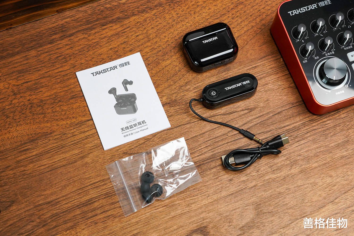 与普通无线耳机不同,除了充电盒与耳机本体、说明书,还WPM-420还多了一个2.4G无线发射器和一根一拖二的充电线,可以同时为充电盒和发射器充电,很方便,另外还有两套备用的耳帽。
