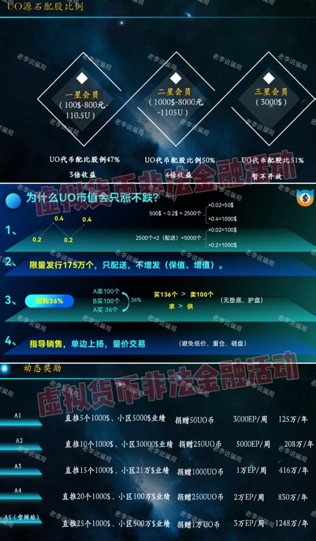 以“区块链+拆分理财”为噱头,违规发行“UO”代币,依据投入金额划分代币配股比例和收益。设置多星会员层级,根据直推人数和小区业绩发放动态收益。