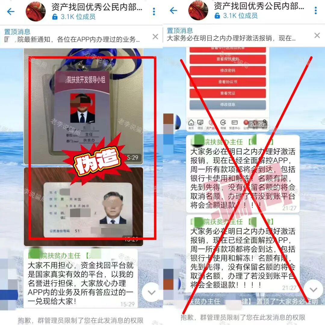 冒充国家扶贫办,盗用公职人员信息伪造工作证,谎称为以往参与各类项目被骗人群找回个人资产、解冻银行卡等等,利用AI数字人制作大量虚假视频,并在群内发布各种伪造的“追回成功收款截图”蒙蔽大众,骗取各种保证金、押金、投资金等等。