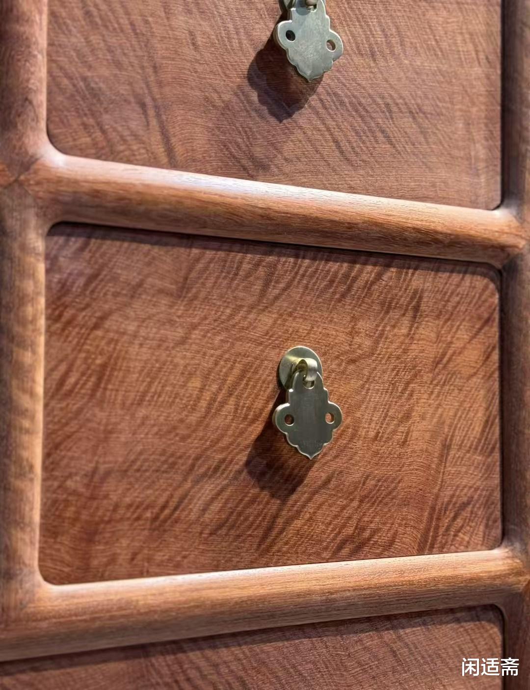 斗柜的珍贵,始于缅甸花梨老料的扎实基底。缅甸花梨素有“红木中的亲民贵族”之称,心材呈金黄至红褐色,纹理细腻流畅,偶见山水纹、虎皮纹等天然肌理,经精细打磨后表面泛着温润蜡光,触感如玉般顺滑。此柜选用生长周期超百年的老料制作,木性稳定不易开裂变形,散发的淡雅檀香气息,久置后转为含蓄幽香,既能舒缓神经,又能有效防虫防蛀,为收纳空间增添自然清新的氛围。