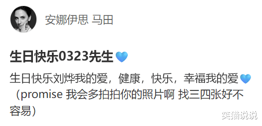 刘烨的妻子安娜在自己的个人社交账号上晒出了刘烨的照片,为刘烨庆贺48岁生日。安娜还配文道:“生日快乐刘烨我的爱,健康,快乐,幸福我的爱。(promise 我会多拍拍你的照片啊 找三四张好不容易)”安娜晒出的照片似乎是刘烨玩潜水活动时拍的,照片中的刘烨穿着潜水服,皮肤也晒黑了许多,但是脸上带着惬意的笑容,似乎很喜欢这一次的潜水活动。