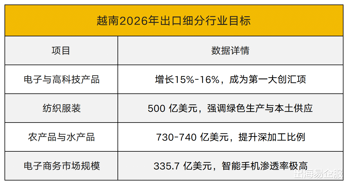 越南在2026年设定了 5130 亿美元的出口目标,较上年增长约 8% 。在经历了2025年创纪录的增长后,越南外贸正在经历从纺织鞋服等传统劳动密集型产业向电子产品、半导体封装及高科技制造的战略转型 。