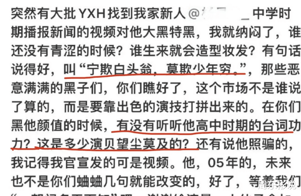 于正除了“不遗余力”为新剧和自家艺人宣传,还很热衷于保持自己的热度。毕竟,当自家新签艺人炒不出热度时,他拿自己出来祭天,效果也十分显著。今年9月份,于正新签的一个男演员,被网友认为颜值“十分泰国”,从而质疑起于正的审美来。于正恼羞成怒,发长文为自己辩解称“宁欺白头翁,莫欺少年穷”、“一朝闻名天下知”。在文中,他还夸这位新人演员台词功底很好。