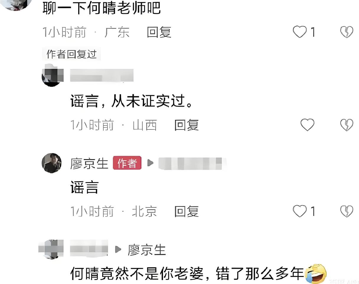 2022年,廖京生入驻短视频平台,网友让他聊一下何晴,他直接回复“谣言”二字。