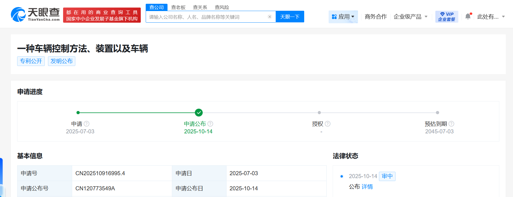 天眼查App显示,近日,赛力斯汽车有限公司申请的“一种车辆控制方法、装置以及车辆”专利公布。