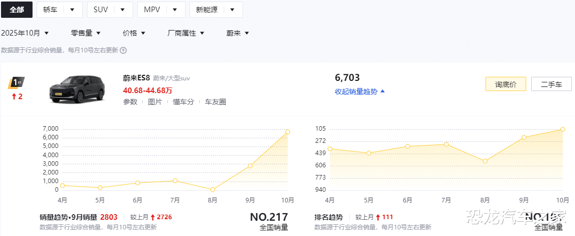 不仅如此,从价格上来看,新款蔚来ES8的官方指导价定在40.68万元起,与老款车型相比便宜了将近10万元。而且值得一提的是,新车也提供了BaaS方案,而租电版本的价格更是低至29.88万元起。与此同时,从销量上可以看到,全新蔚来ES8在十月份一共交付了6703台新车。所以说到这里,下面我们就针对第三代蔚来ES8,看看它的产品实力如何。
