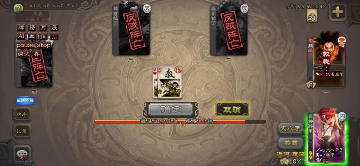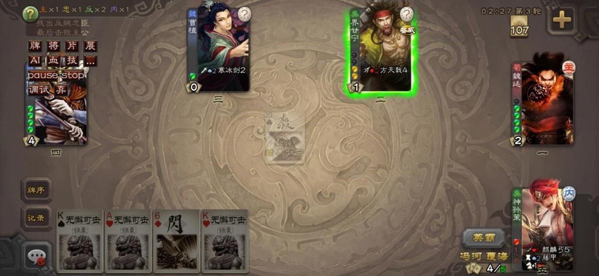 那么玩法确定了就知道什么时候放标记了,阶段是出牌阶段放就暗示了不要一上来就无脑先放标记,既然覆海只能让一张牌强中,那么这张牌最好的就是两张杀,先普通杀一下,然后再标记平定触发“使用牌无限制且无法响应”,那么第二张杀就无法闪避,最好可以喝个酒将伤害最大化。