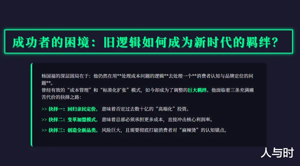 杨国福的成功源于对"成本管理"的深刻理解。但当外部环境改变时,曾经有效的规律也会变成羁绊。如何在变化中调整自己,而不是被变化所淘汰,这才是真正的考验。杨国福还有时间做出选择,但时间已经不多了。