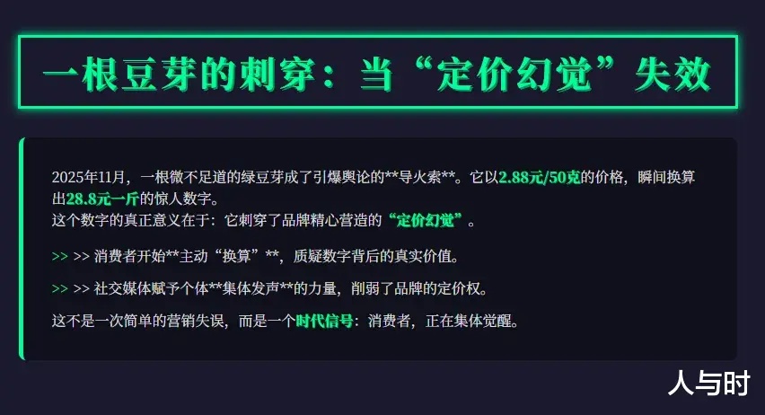 但这不仅仅是一次定价失策的舆论风暴。这是一根豆芽刺破的,是一个时代的信号——消费者正在觉醒。他们开始主动进行"换算",质疑数字背后的真实价值,拒绝被"定价幻觉"所蒙蔽。
