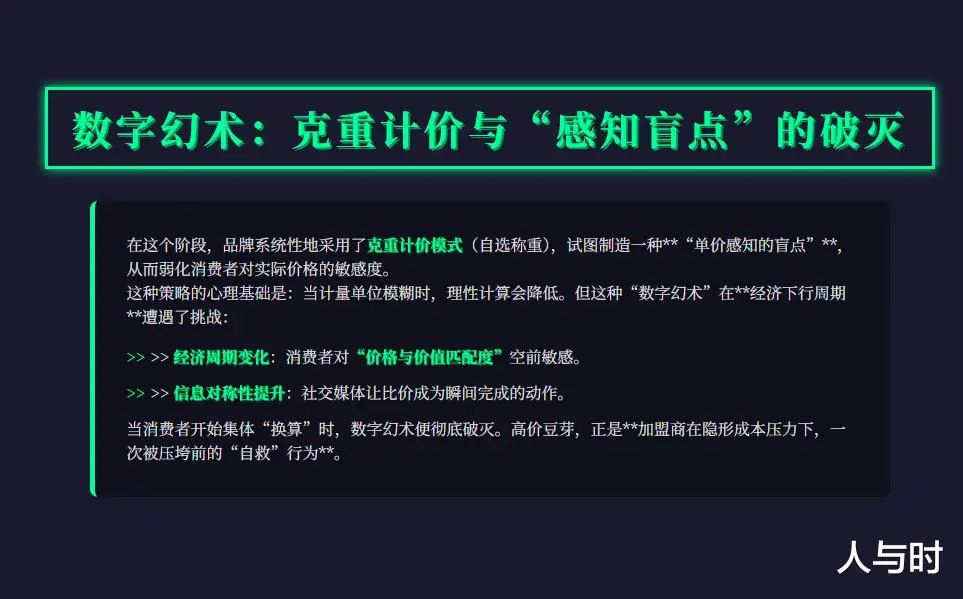 这表明:品牌曾经依赖的"数字心理学"已经失效了。消费者已经学会了"换算",已经拒绝被蒙蔽。