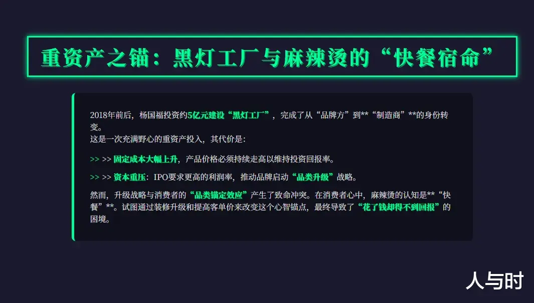 转型迷途:从制造商到资本市场 (2015-2023)黑灯工厂:重资产的野心与代价2018年前后,杨国福投资约5亿元建设高度自动化的"黑灯工厂"。这个投资决策标志着杨国福从"品牌方"向"制造商"身份的转变。其战略意图是掌控上游供应链,提高毛利率。