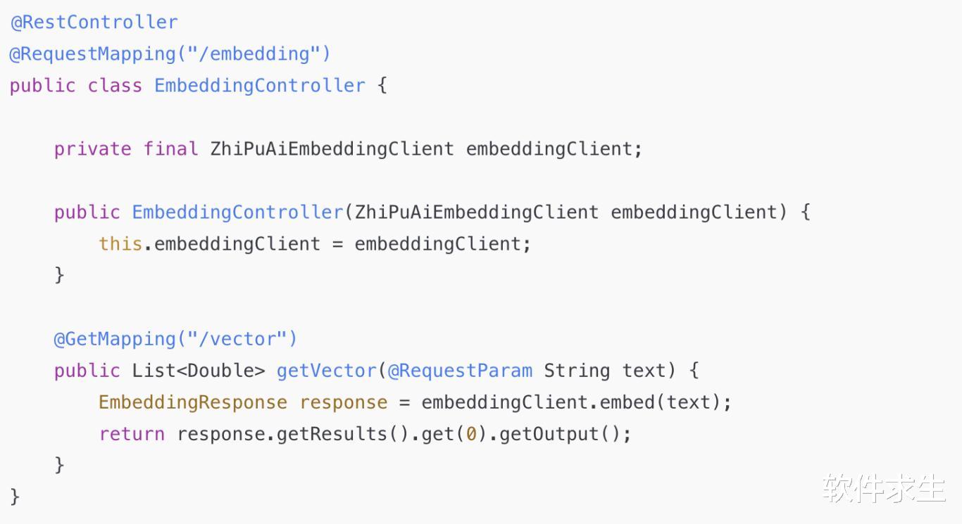 它们在向量空间中“彼此靠近”,之后你只需要使用向量相似度搜索,就能实现语义检索。而 Spring AI 则是帮我们用 Spring Boot 的方式,优雅地接入智谱 AI。