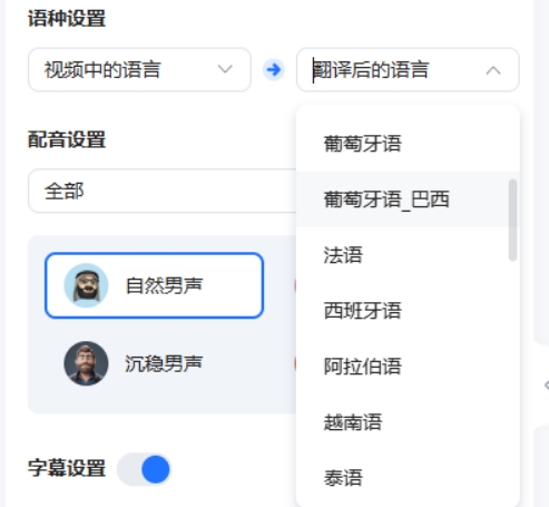 ②AI自动配音:可以在翻译时,选择使用语音进行翻译,在翻译完成后,也可以根据自己的需求调整声音的类型和风格来让最终输出的声音也变成相应的目标语言。