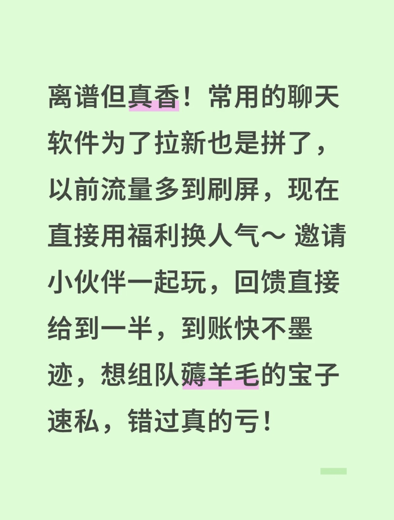 离谱但真香!常用的聊天软件为了拉新也是拼了,以前流量多到刷屏,现在直接用福利换人气~ 邀请小伙伴一起玩,回馈直接给到一半,到账快不墨迹,想组队薅羊毛的宝子速私,错过真的亏!