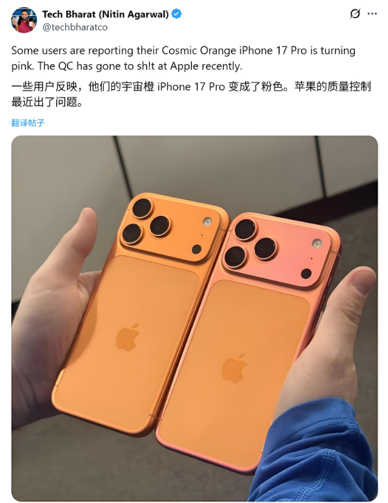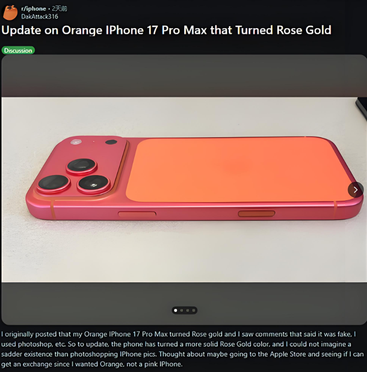 1. 褪色现象集中爆发,色彩“消失术”引用户不满首批iPhone 17 Pro Max用户反馈,主推配色“星宇橙”及“深蓝色”的铝合金边框出现异常褪色。褪色通常从相机岛区域开始,逐渐扩散至整个金属边框,而背部哑光玻璃面板保持原色,形成“拼色”反差。部分用户调侃:“晒一天太阳,橙变玫瑰金,免费换新色”——这一现象在社交平台引发大量实拍图佐证,褪色后机身呈现粉金或玫红色调,与宣传图差异显著。