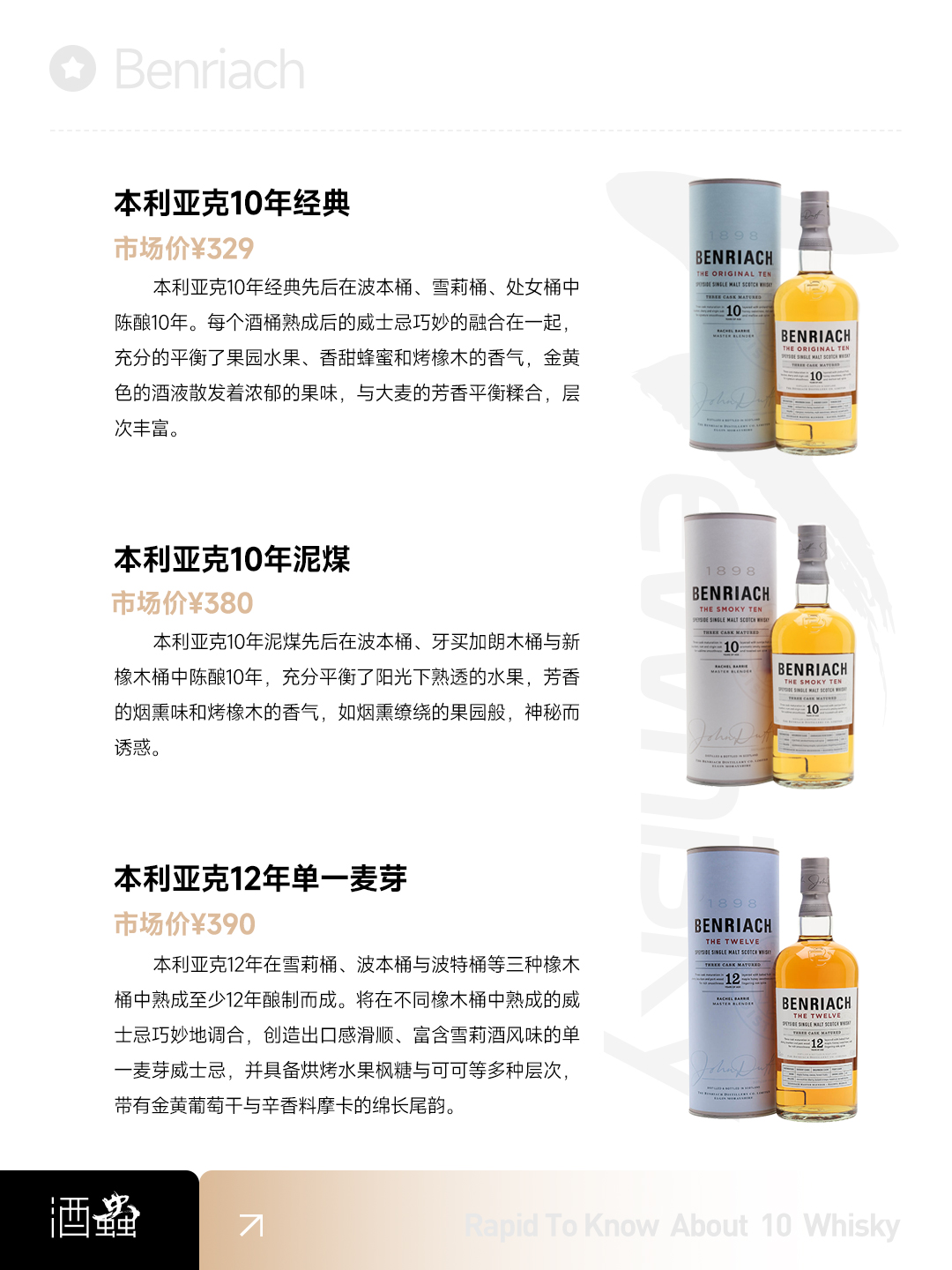 本利亚克 10 年泥煤先后在波本桶、牙买加朗木桶与新橡木桶中陈酿 10 年,充分平衡了阳光下熟透的水果,芳香的烟熏味和烤橡木的香气,如烟熏缭绕的果园般,神秘而诱惑。