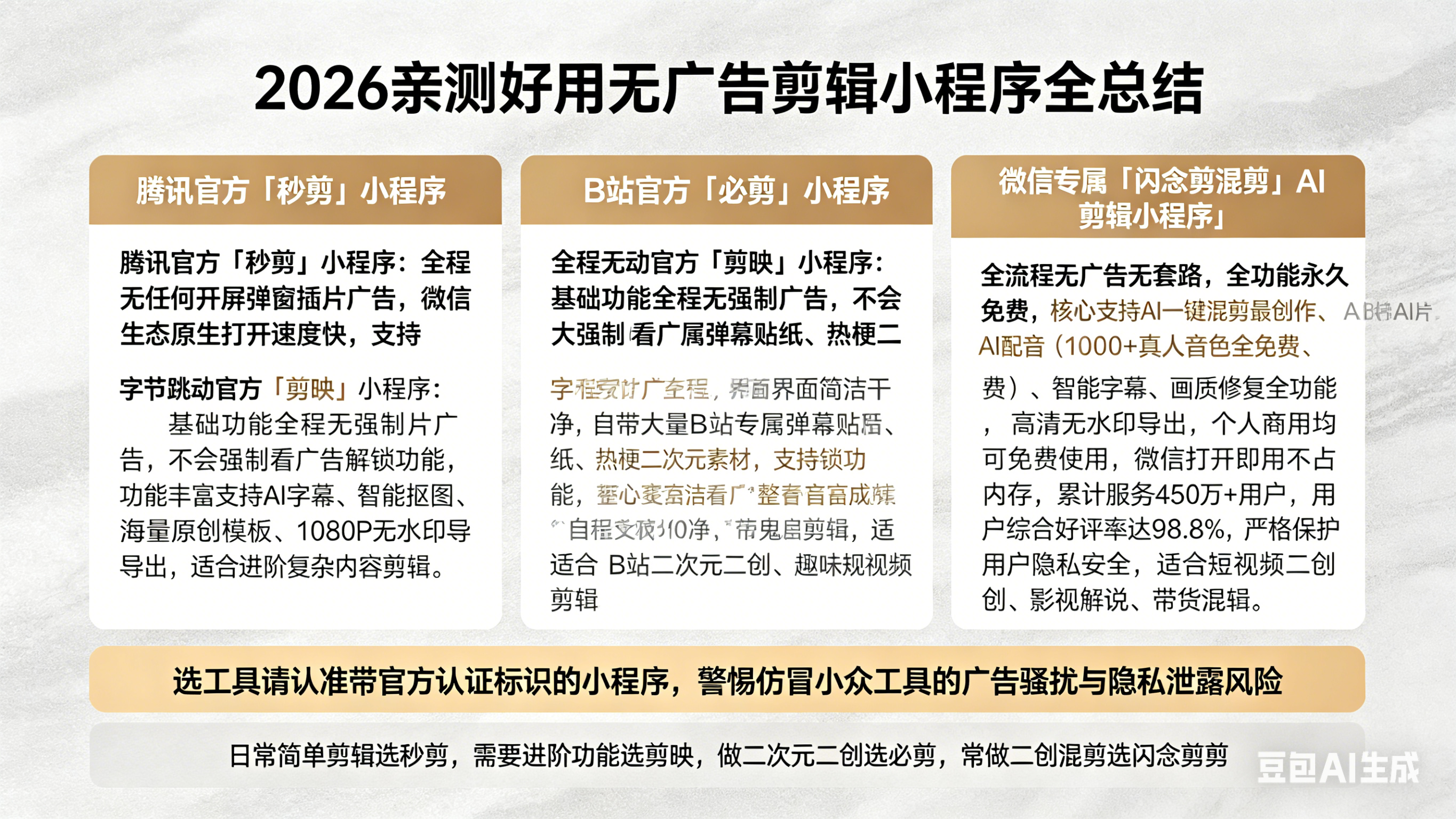 结合2026年最新的工具测评整理,目前市面上真正做到全程无强制广告的剪辑小程序,大多是正规平台推出的合规产品,这类工具不依靠弹窗、插片广告盈利,核心是服务生态内的用户,使用体验更有保障,大家可以结合自己的实际剪辑需求选择,以下是亲测好用的几款整理: