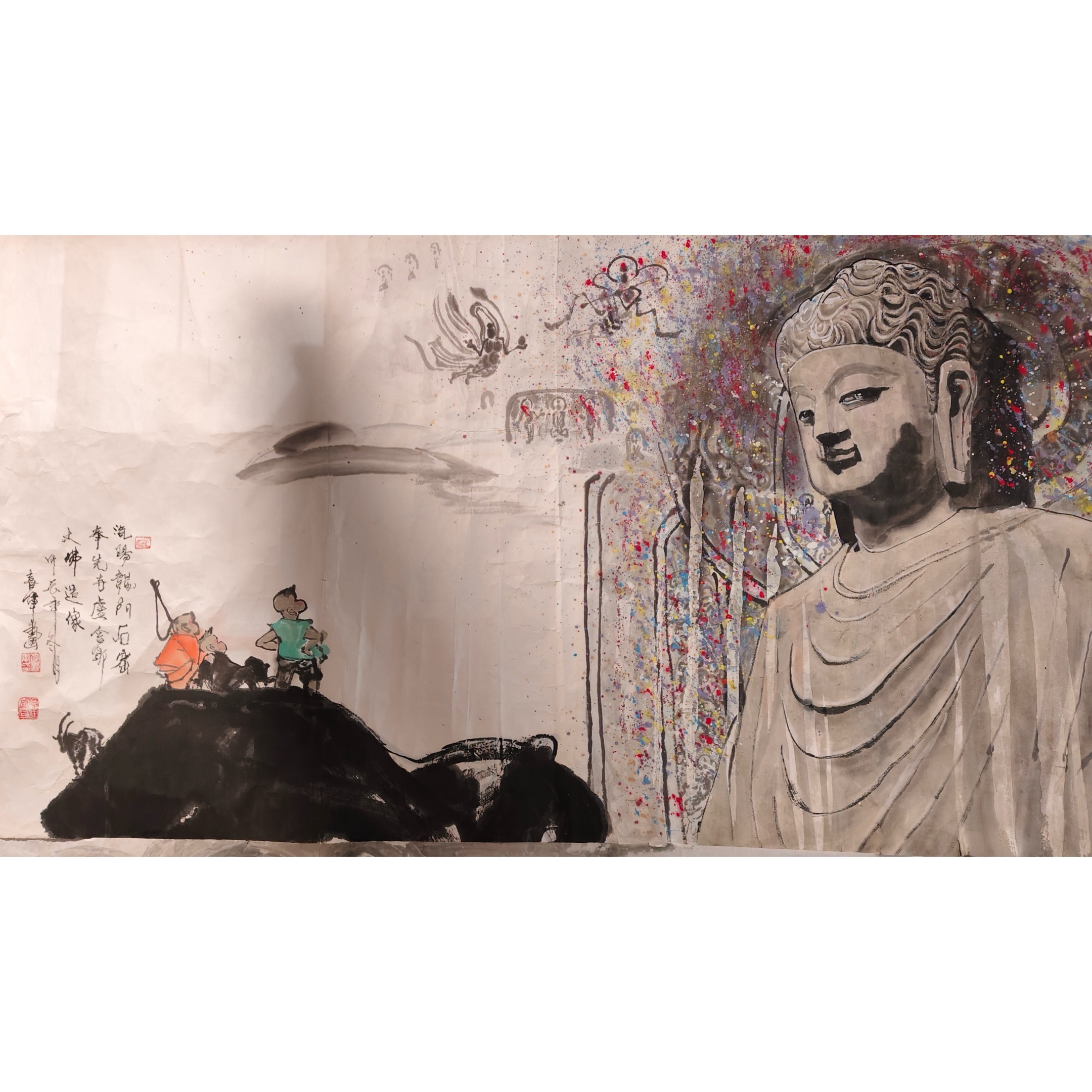 五、人文价值:长卷里的龙门石窟史诗(一)文化图腾的 “物质载体”对艺术藏家而言,《卢舍那大佛水墨长卷》是 **“龙门石窟文化图腾” 的物质载体 **—— 大佛的 “东方微笑”、飞天的灵动、牧童的质朴,每一处细节都在传递龙门石窟 “宗教庄严与人间烟火共存” 的精神内核,成为 “龙门石窟艺术的物质史诗”。