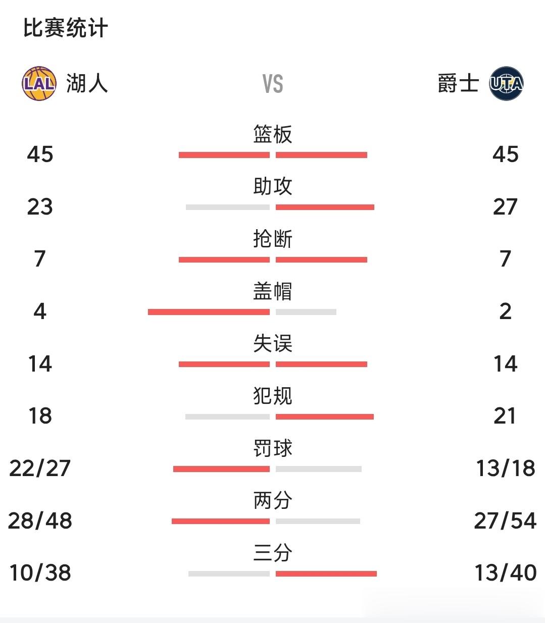 数据方面,双方基本持平,湖人在罚球上比爵士多得9分。湖人全场获得27次罚球。