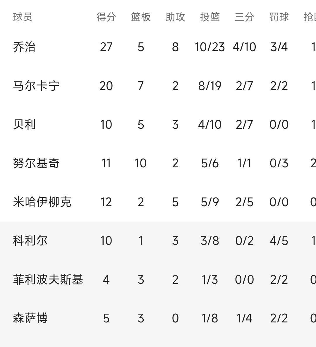 爵士这边。乔治拿到27分5篮板8助攻,马尔卡宁20分7篮板2助攻,努尔基奇11分10篮板。