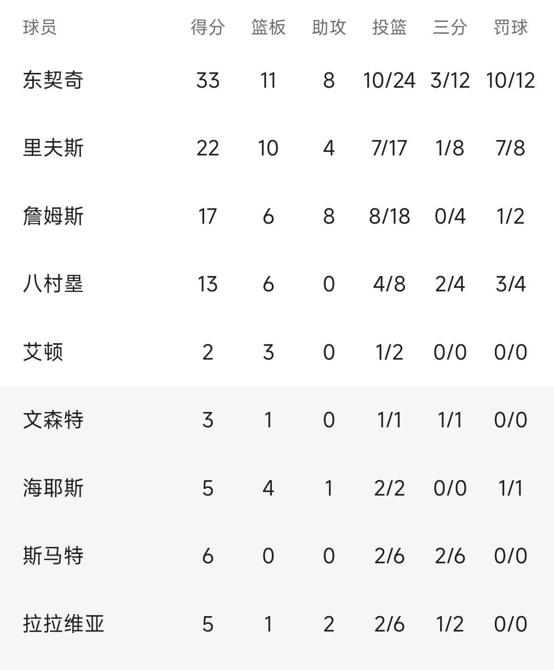 球员方面,詹姆斯效率一般,18次出手仅仅得到17分和6篮板8助攻。东契奇贡献33分11篮板8助攻的准三双,里夫斯22分10篮板4助攻。