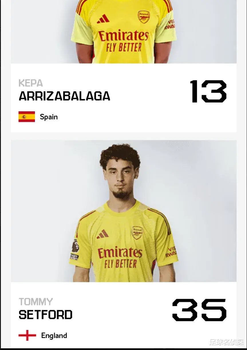 塞特福德出现在了阿森纳一线队的官方名单中,这名门将其实从上赛季末开始就成为了一线队的一部分。
