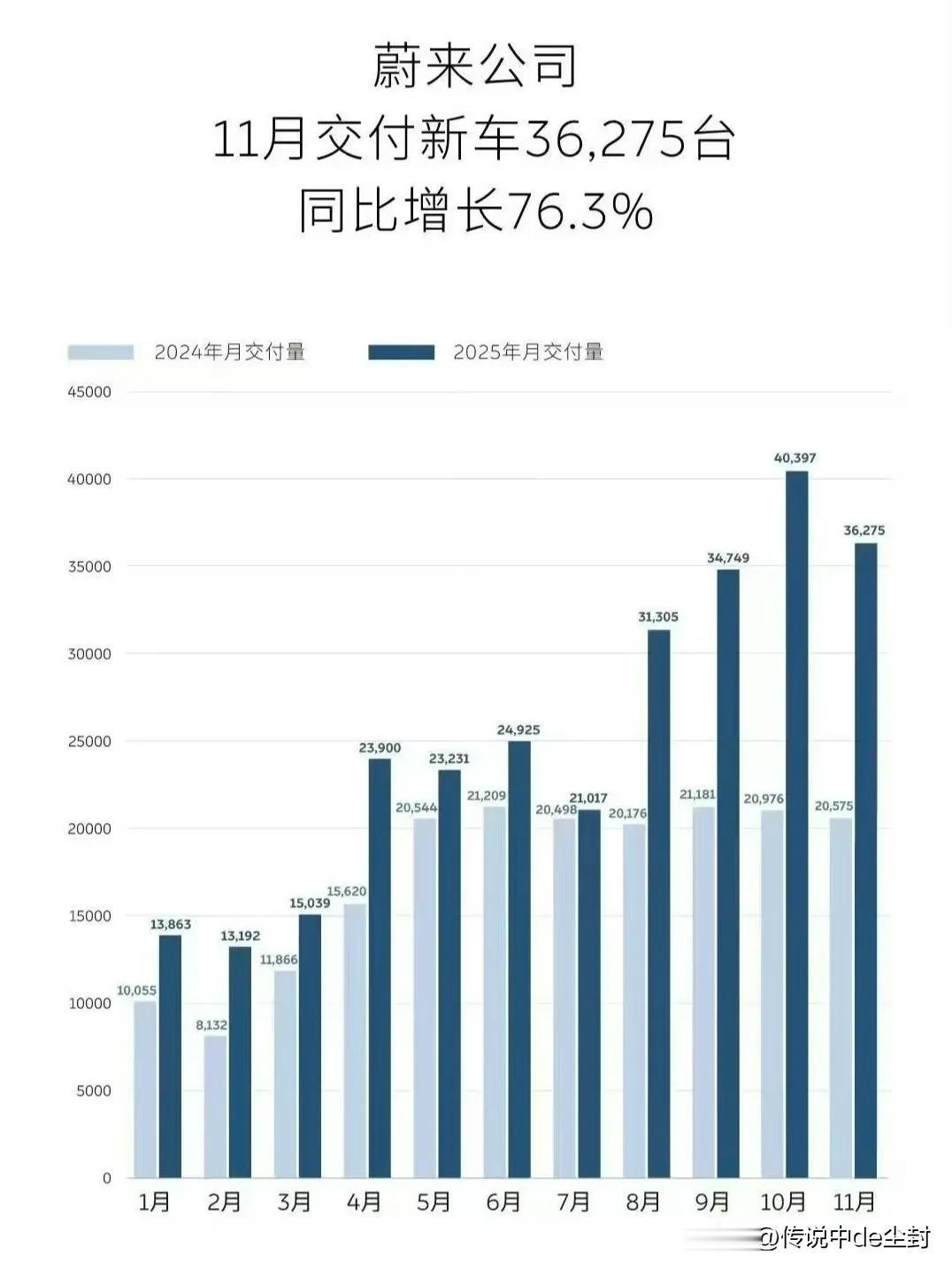 蔚来11月交付36275台,没能保持4万大关有点可惜,小鹏也是类似的境地,11月交付36728台,两家在10月份都是破4万的。