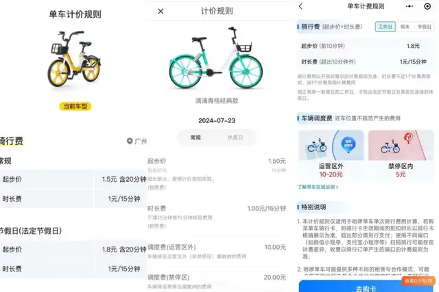 2024年7月底,哈啰等单车品牌在成都、广州、武汉等城市调价,收费标准由工作日前1.5元/15分钟调整为前10分钟1.5元,周末节假日起步费也由前1.8元/15分钟调整为前10分钟1.8元,后15分钟收费1元。