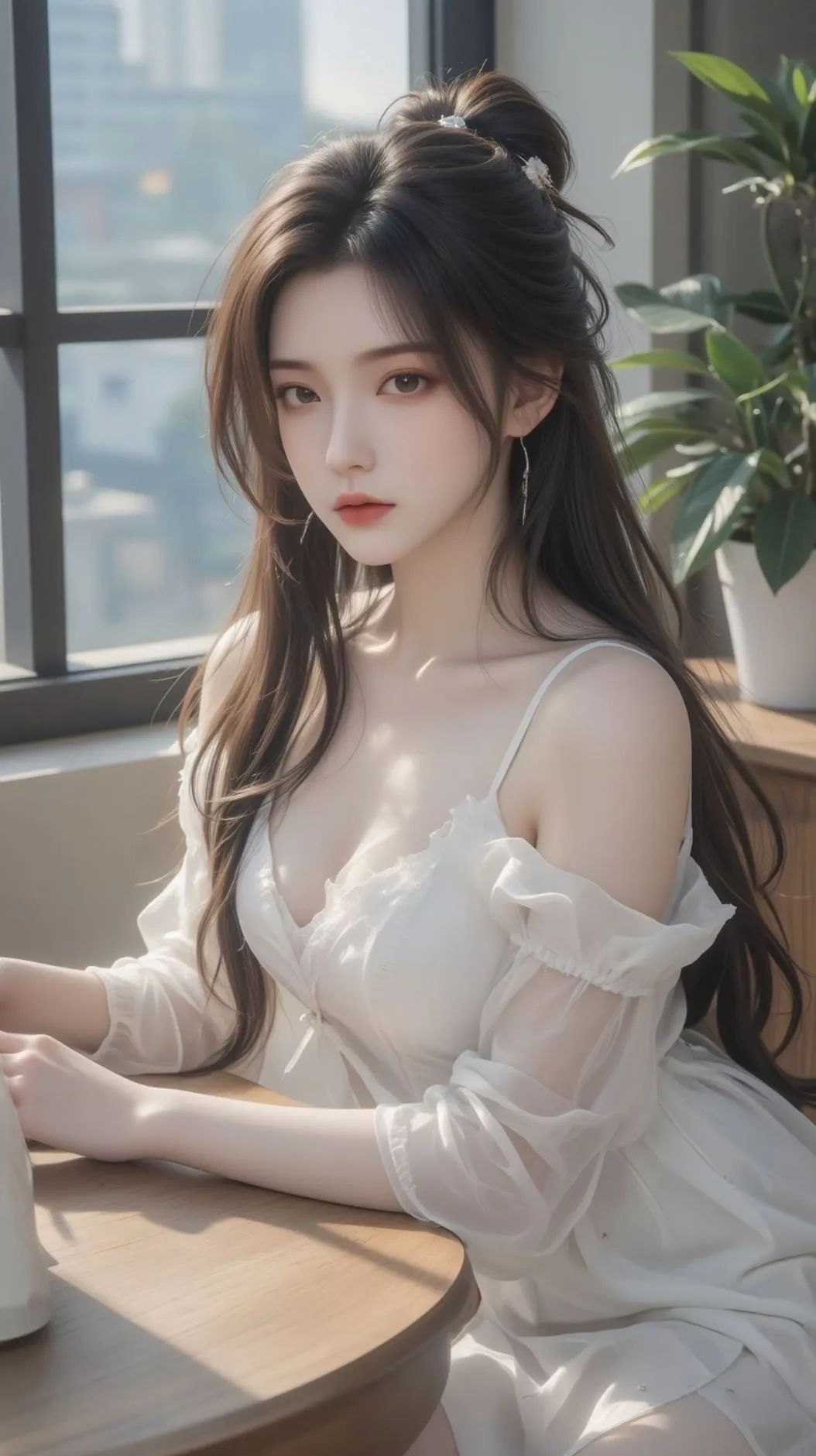 她的手指细长,此刻正绕着杯耳缓缓移动。热可可的暖意并不能融化她眉间的冰雪,反而与她那似乎与生俱来的疏离感形成了奇特的和鸣。卫衣的宽松遮掩了平素青衣时的飘然,却意外凸显了她侧脸的凌厉线条;半身裙的褶皱间,偶尔泄露出几分属于少女的轻盈,但很快又被她周身那“生人勿近”的气场吞没。