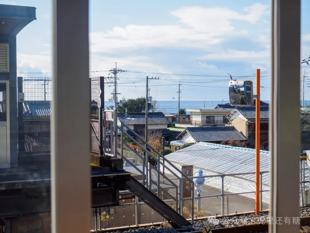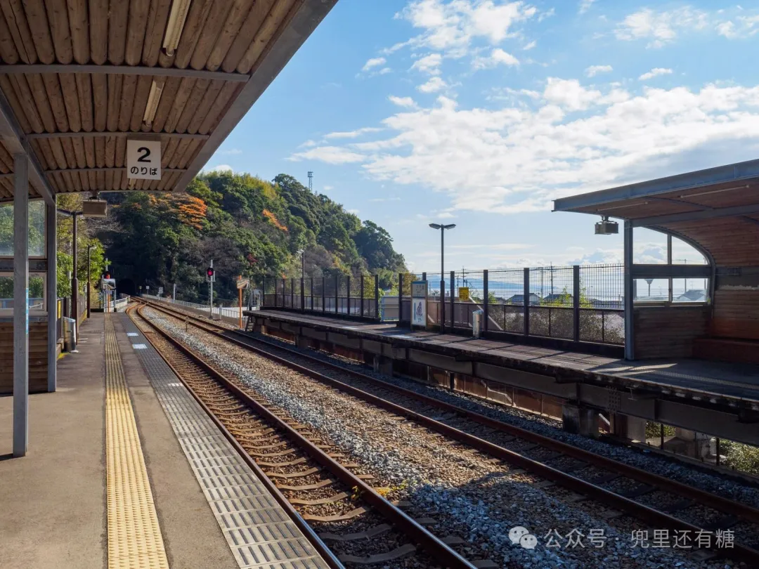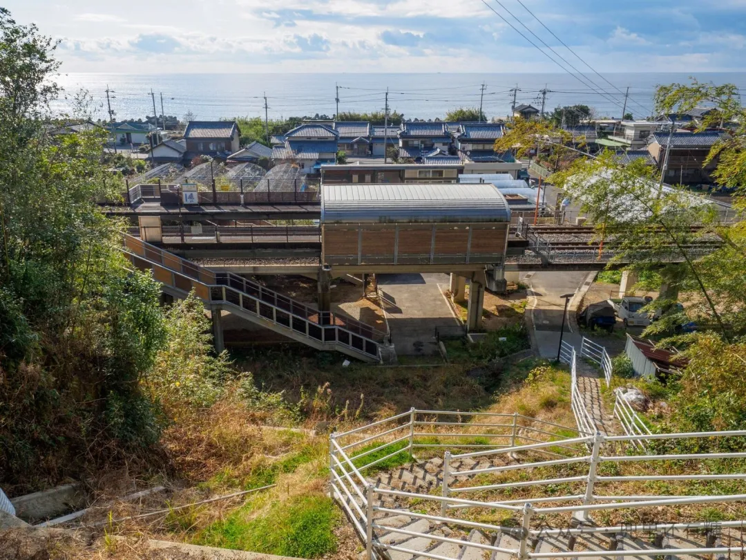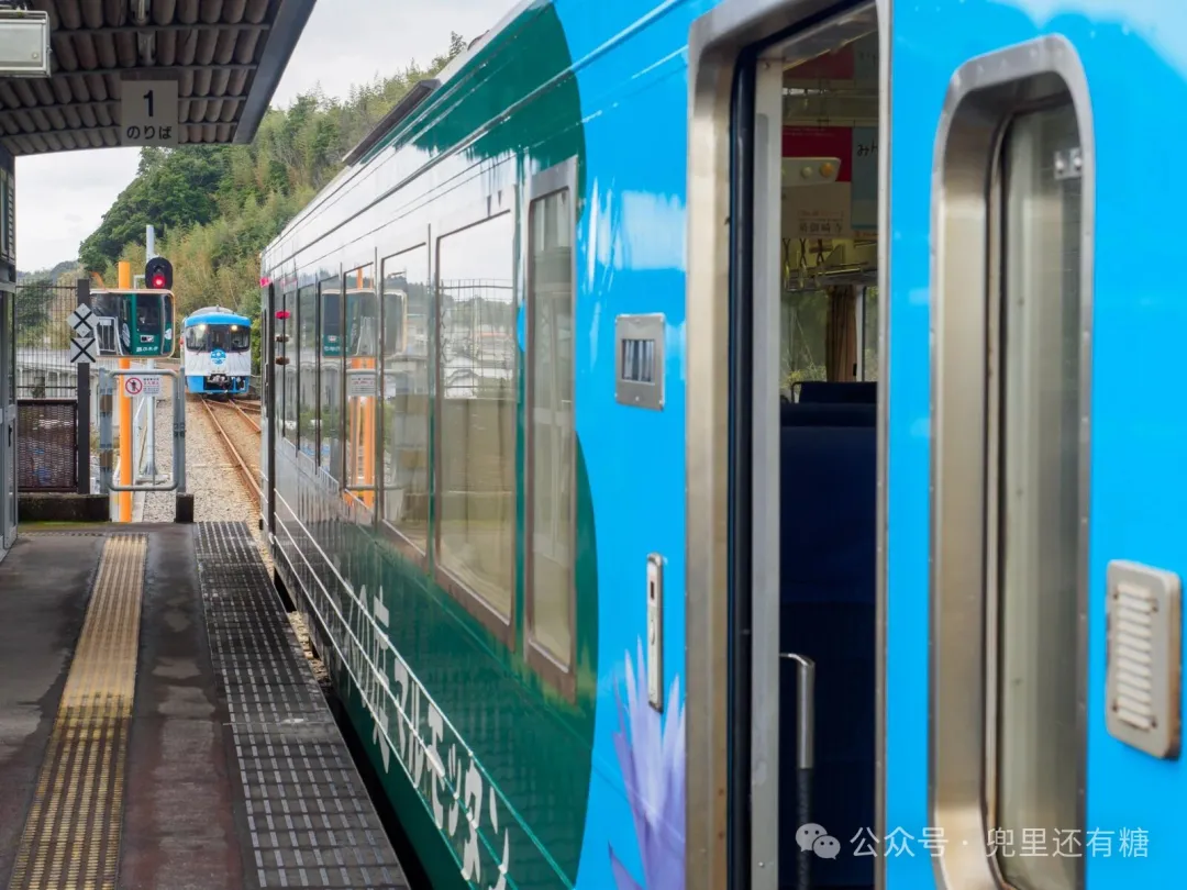 火车经常在阿纳奇车站交汇。从相反方向过来的列车是新太郎号,它的甲板位于海边。