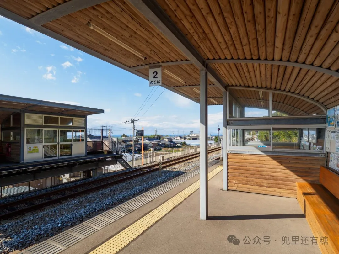 站台末端的候车空间由原木制成,具有屋顶和墙壁一体化的现代结构。
