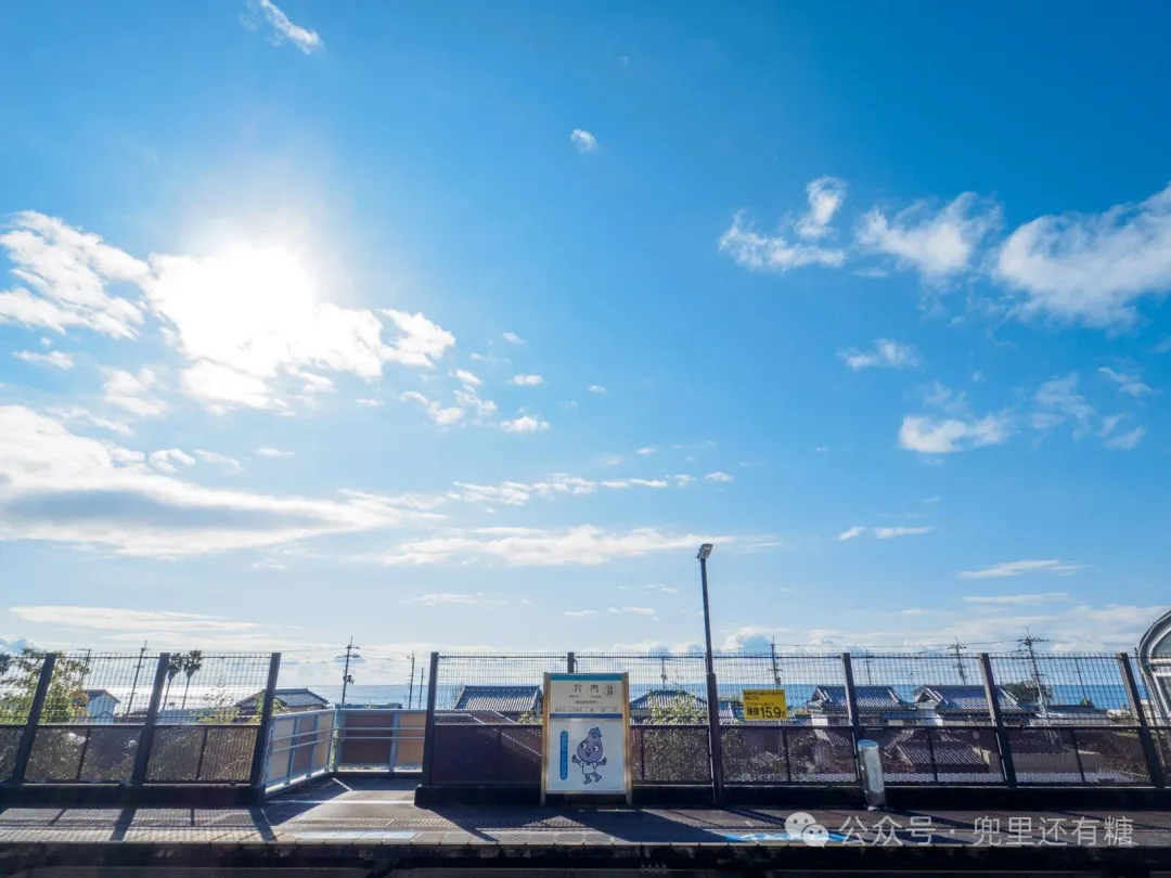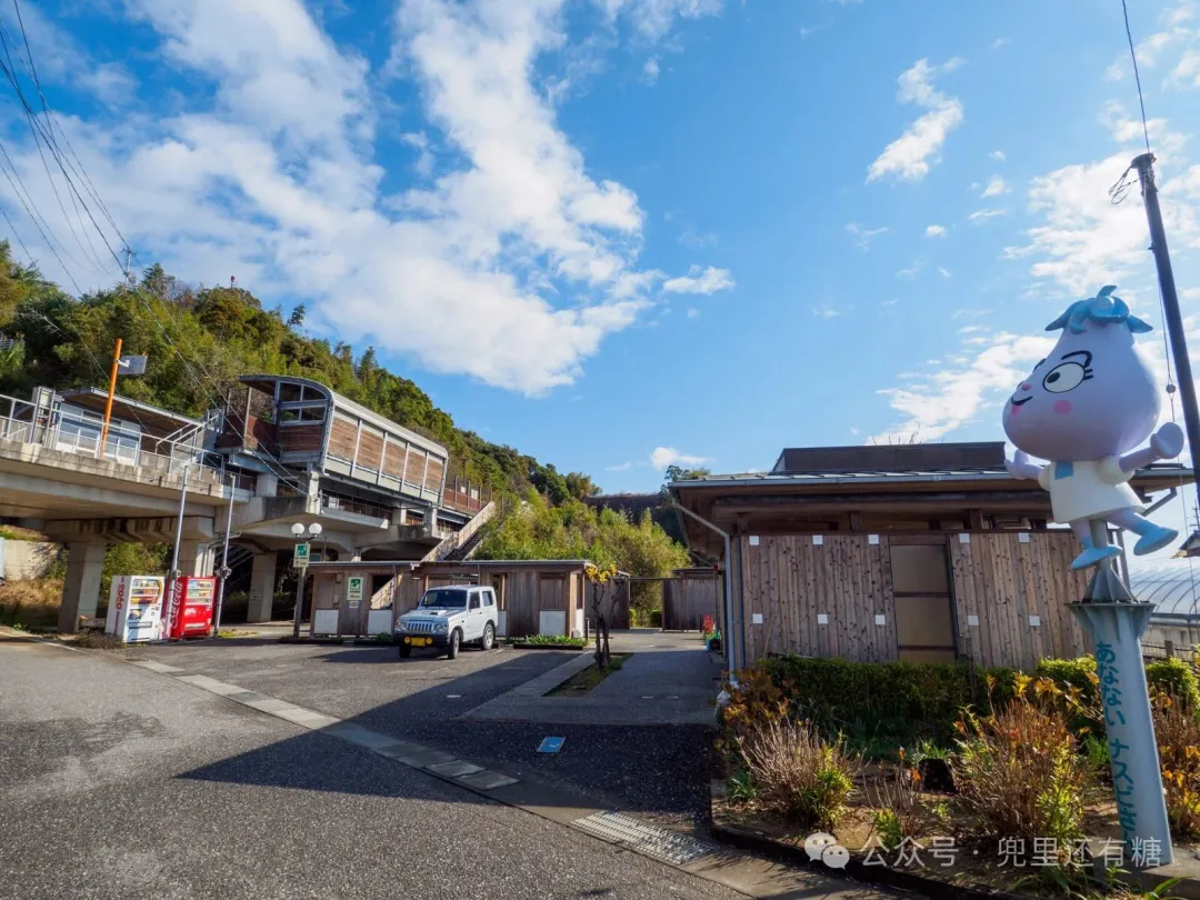 从国道一进入内陆狭窄的道路,就看到了阿纳奇车站。这是一个无人车站,没有站房,照片右边的建筑是厕所。右边迎接我的人是阿那内站的角色“阿那内那须同学”。