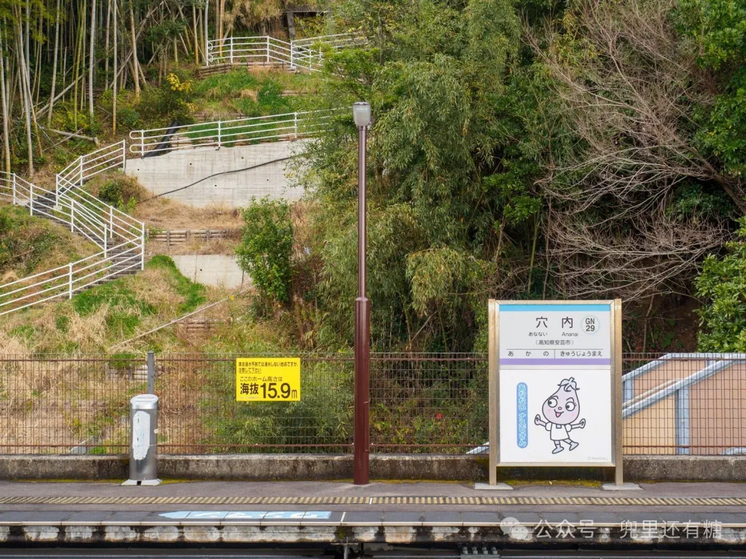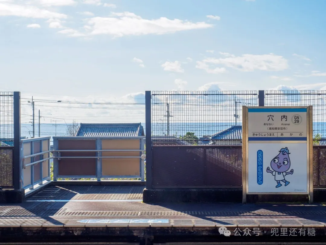 站名牌上也有Nasubi先生的名字。后免奈半线的每个车站都有一个由高知县柳濑隆创作的角色,据说这个角色是以安艺市温室里普遍种植的茄子为原型。