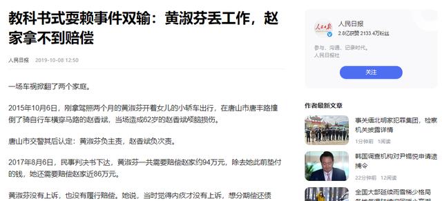 信息来源:人民日报 2019-10-08 教科书式耍赖事件双输:黄淑芬丢工作,赵家拿不到赔偿