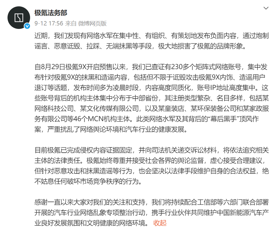 在发现230多个账号集中抹黑后,极氪没有等谣言继续扩散,而是第一时间行动:法务部快速固定了所有证据,包括账号发布记录、IP地址、MCN机构关联信息等,紧接着就把完整的诉讼材料递到了司法机关,明确要依法追究相关主体的法律责任,不给“黑公关”留任何反驳的空间。