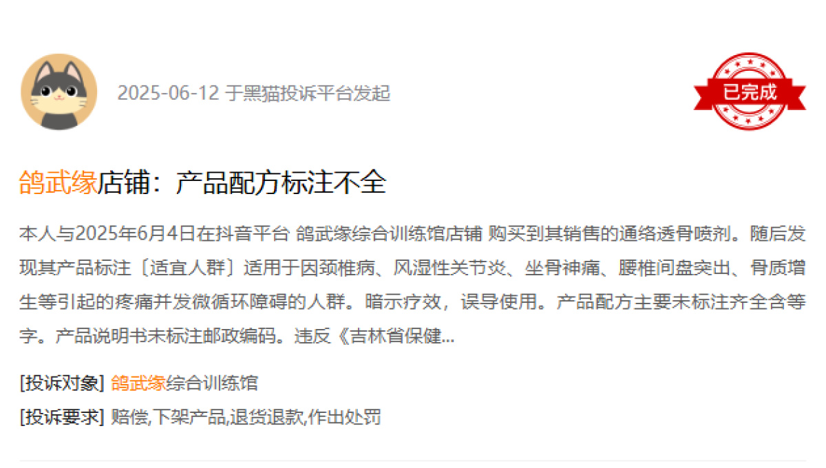 此外,另一款商品“通络透骨喷剂”也被消费者在“黑猫投诉”平台投诉。投诉内容指出,该产品说明书中列举了“颈椎病、风湿性关节炎、坐骨神经痛、腰椎间盘突出、骨质增生”等具体病症,涉嫌暗示产品具有治疗效果。