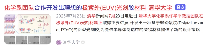 7月28日,清华大学发布消息称,该校化学系许华平教授团队在极紫外(EUV)光刻材料上取得重要进展,开发出一种基于聚碲氧烷的新型光刻胶,为先进半导体制造中的关键材料提供了新的设计策略。