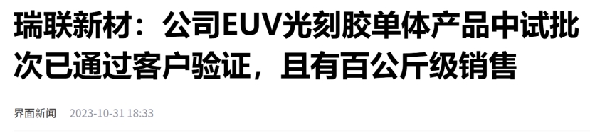 光刻胶产品:公司EUV光刻胶单体产品中试批次已经通过客户验证,并且有百公斤级的销售。