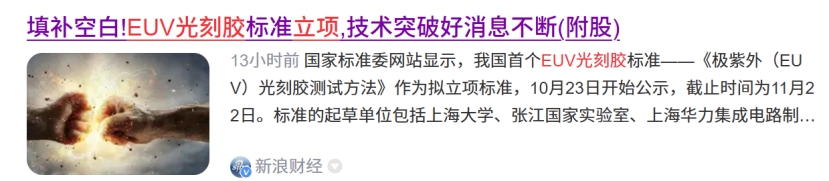 10月27日消息,我国首个EUV光刻胶标准——《极紫外(EUV)光刻胶测试方法》作为拟立项标准。