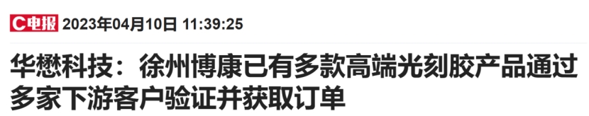 光刻胶产品:徐州博康光刻胶品类覆盖i线、KrF、ArF干法、Arf湿法光刻,其中部分产品已经实现销售收入。