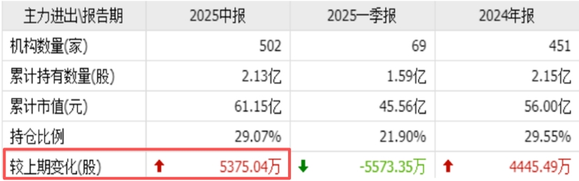 机构动态:二季度持股机构数502家,较一季度增加433家,合计持股2.13亿股,加仓5375万股。