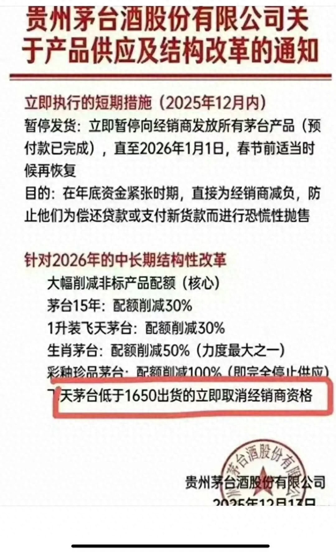 该通知内容包含贵州茅台对2026年的中长期结构性改革,称将立即暂停向经销商发放所有茅台产品(预付款已完成),暂停时间至2026年1月1日,春节前视情况再行恢复,并规定“飞天茅台低于1650元出货的,立即取消经销商资格”。